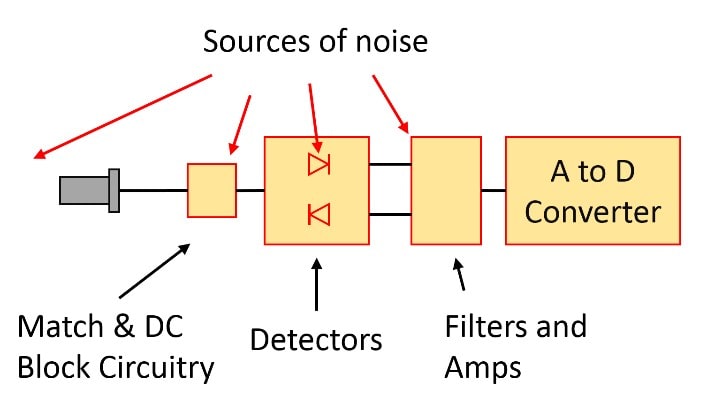 Noise is always present in any electrical system, further all components generate electrical noise in some form or another. A simple internet search for “resistor noise” will net many, many results and may help put noise sources into perspective. Noise reduction in passive components is a science in itself. As a result of noise power, with no user signal present, there can be measurable power that may interfere with a low level signal when applied. Figure #2 depicts a power sensor input system with internal noise sources indicated.