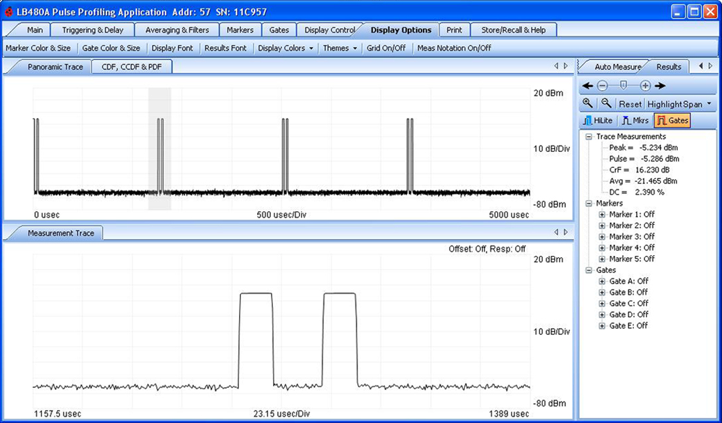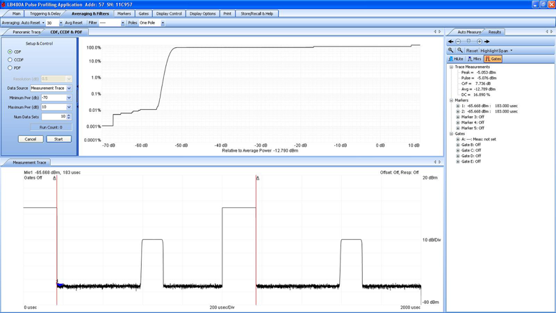 With a LB480A or LB680A LadyBug RF Power Sensor and our PPA-4, Pulse Profiling Power Meter Application you receive a time domain power profile including triggered pulse measurements. Average power can be measured with these sensors using our PMA-3 Power Meter Application. For LB59XXX products use our PMA-12 Precision Power Meter Application.