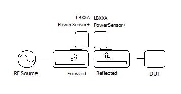 By adding a third LBXXA Power Sensor transmission measurements (S21 or S12) can be made. Port match of the power sensor and of the reflectomer in combination with DUT’s S parameters determine errors in measuring the DUTs S21 or S12. Measurement error for a DUT with S21 = S12 = 0 dB is typically 0.27 dB (DUT match = 15 dB, Power Sensor match = 27 dB, reflectometer match = 19 dB). Increasing DUT S21 and S12 can reduce this error to .22 dB; this error would begin to rise when considerations for dynamic range are included.
