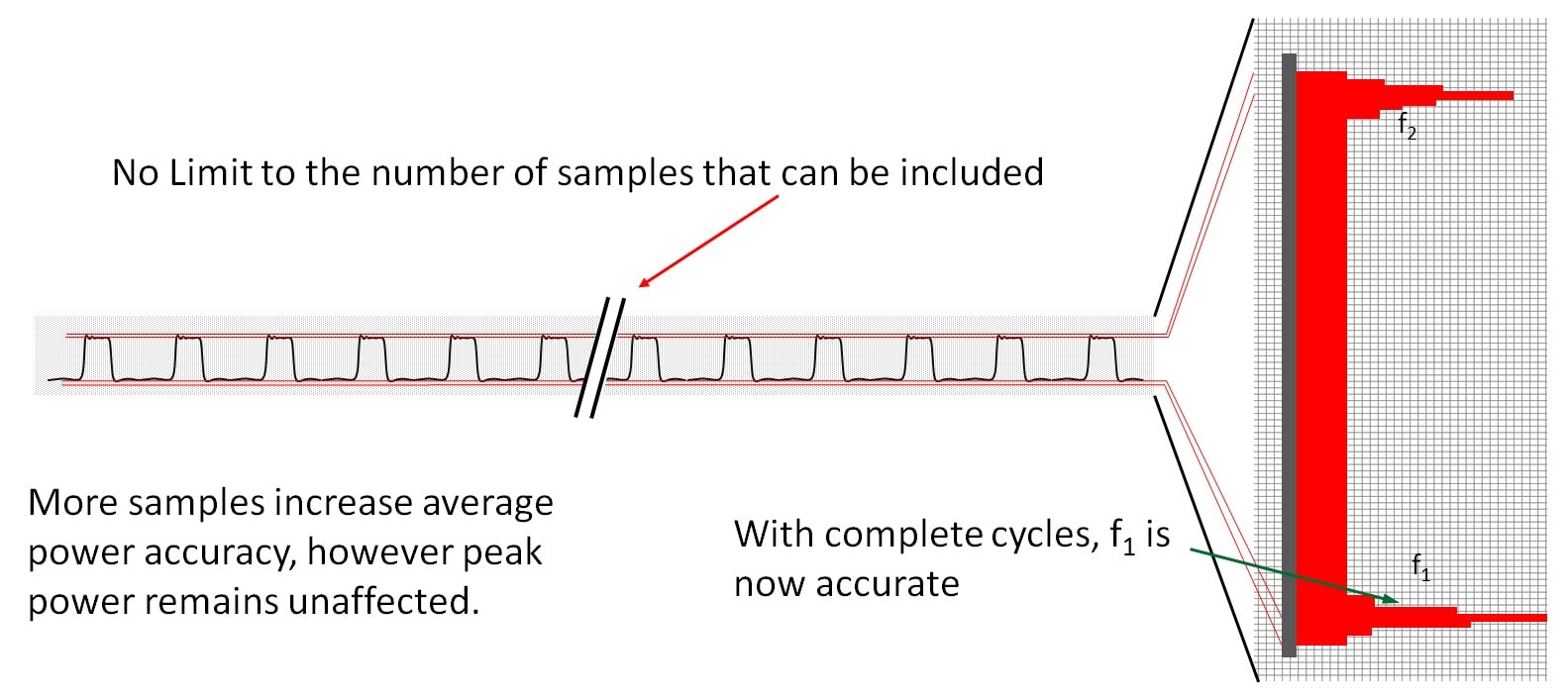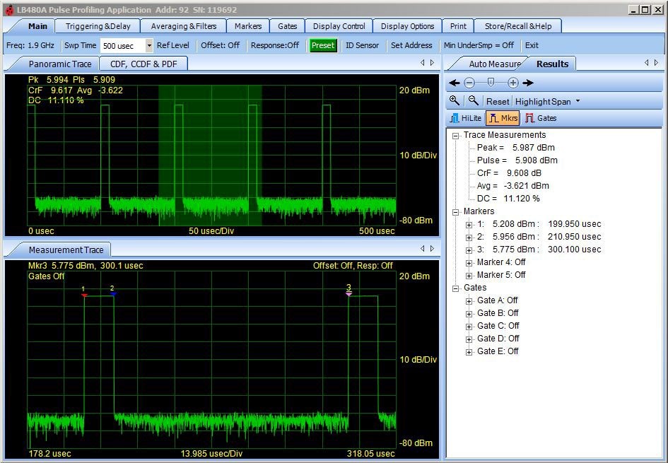 Now let’s see what a real power sensor can give us as a measurement. Using the pulse information and algorithms found in the IEEE specifications, the LB479A sensor makes economically accurate measurements such as those shown below.