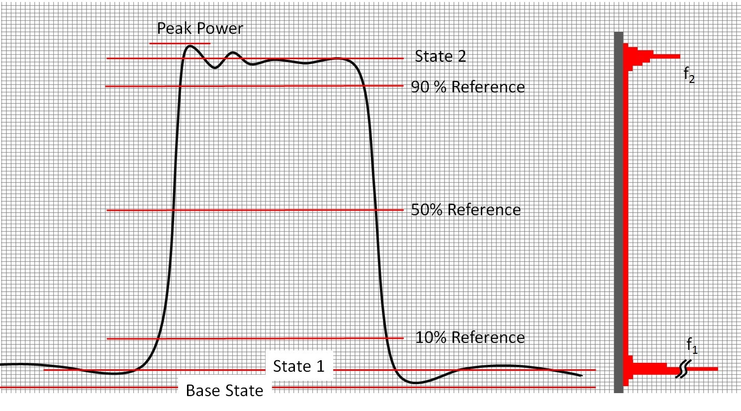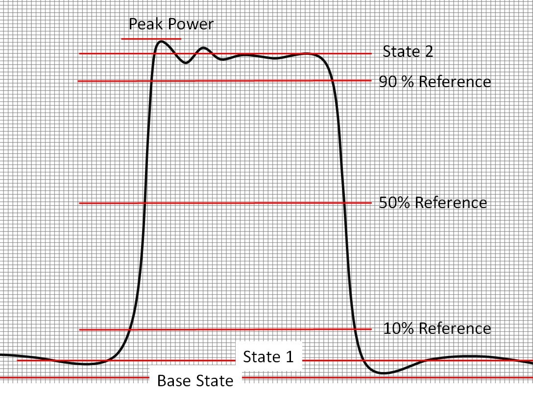 This Power Level is recognized as the power at the leading and trailing pulse edges. Once this is known, Duty Factor can be calculated. To calculate Duty Factor, we won’t actually use the power level at the 50% Reference because the calculation will be done with bin counts. Since the 50% reference represents the leading and trailing edges of the pulse, all bin counts above the Reference represent time that the Pulse is Active.